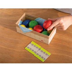 Le dé indique que l’on cueille un fruit ou que le corbeau futé s’approche. Le lancer du dé et le classement stimulent une première reconnaissance et la désignation des couleurs, des formes et des symboles et apprennent à comprendre une règle du jeu basique.
